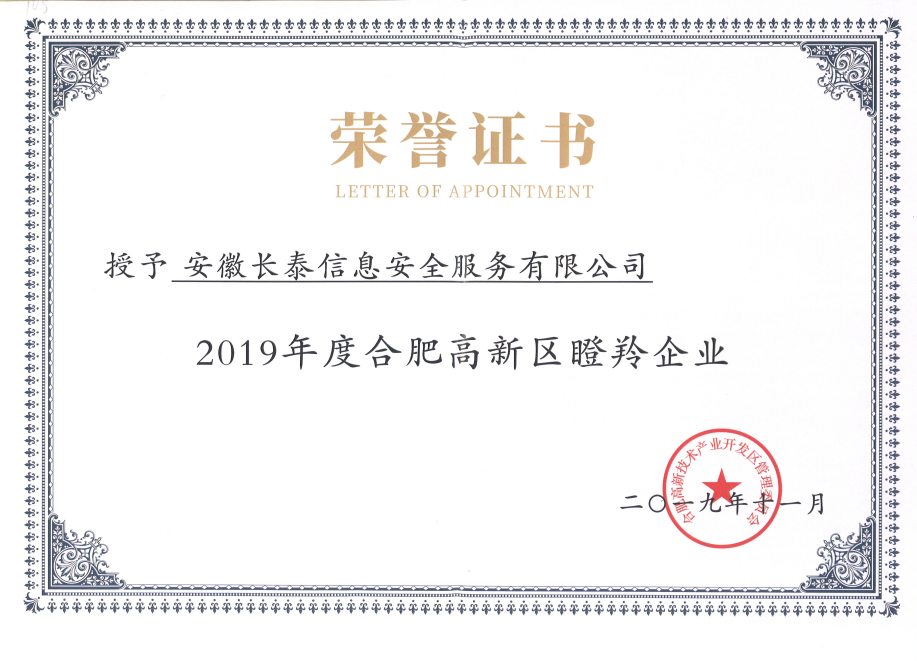 2019年,11月20日,合肥高新区2019年高成长企业榜单正式发布,高新区共认定了502家高成长企业,其中雏鹰企业275家、瞪羚培育企业72家、瞪羚企业149家、潜在独角兽企业3家、独角兽企业1家、平台型龙头企业2家。作为其中的高科技企业——安徽云顶国际·(中国)唯一官方网站成功入选瞪羚企业榜单。